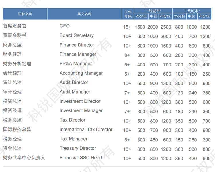 以下是猎头招聘公司yl23411永利国际发布的薪酬报告对财务领域的职位薪酬信息统计,供企业和猎头招聘时参考。