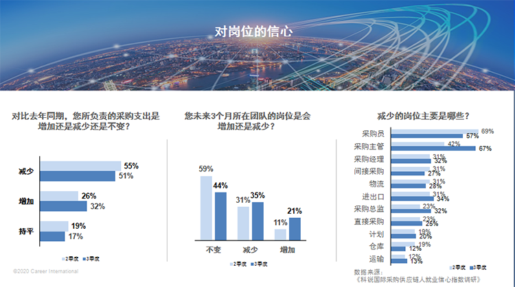 yl23411永利国际自今年第二季度开始调研并发布采购供应链人就业信心指数,从三个维度,即外部环境信心、工作环境信心、岗位信心解读采购供应链人的就业信心。第二季度的调研结果是展望第三季度,可以看出大家对外部环境的信心不足是主流判断,就工作环境而言,高达61%的采购人认为未来三个月外部工作机会减少,只有18%的人对未来一年内公司内部职业开展有信心,但有意思的是大部分人对未来三个月工资稳定性有信心。