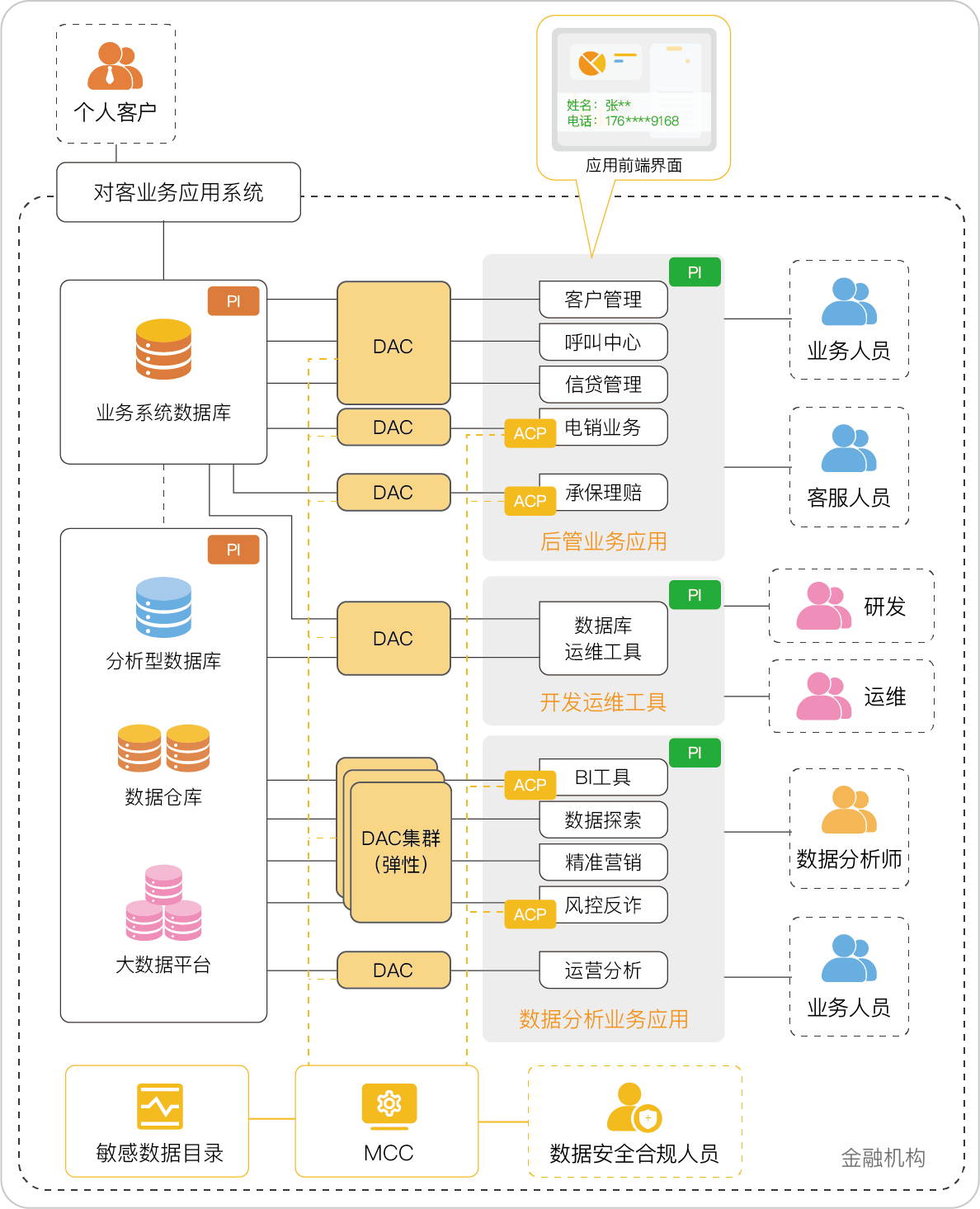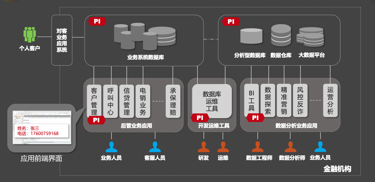 金融组织的内部人员,包括业务、客服、研发运维以及数据分析人员,在不同场景下访问消费者个人信息数据时,面临着诸多风险,其中包括应用前端界面展示的诸多用户个人信息,如身份证号、银行账户、交易明细、家庭住址等敏感信息存在被泄露、滥用的风险。